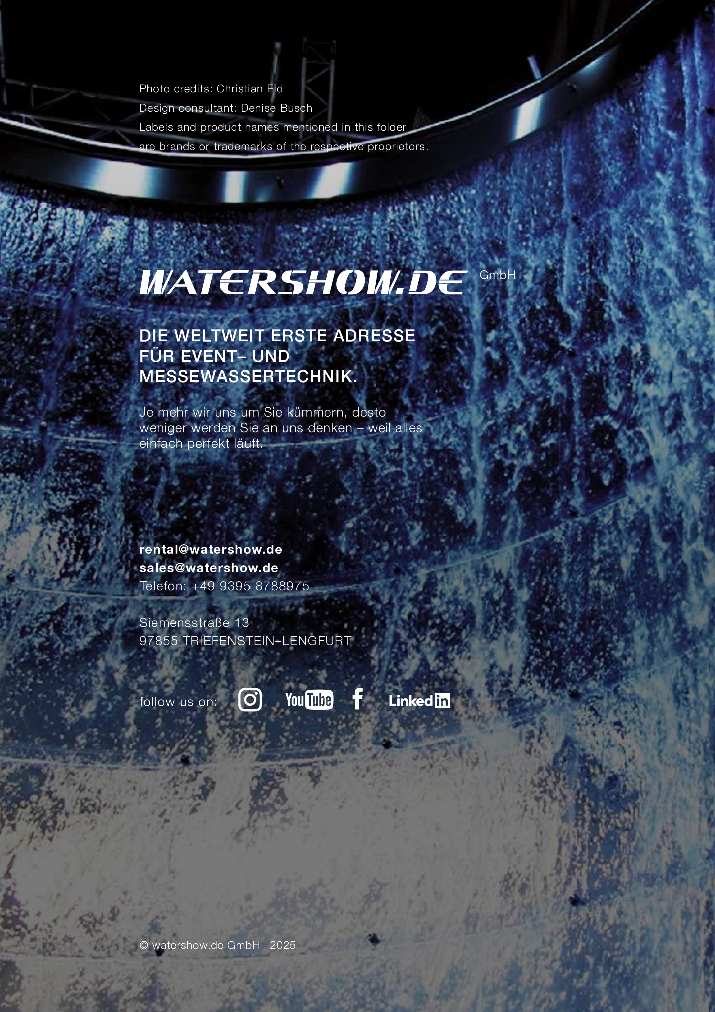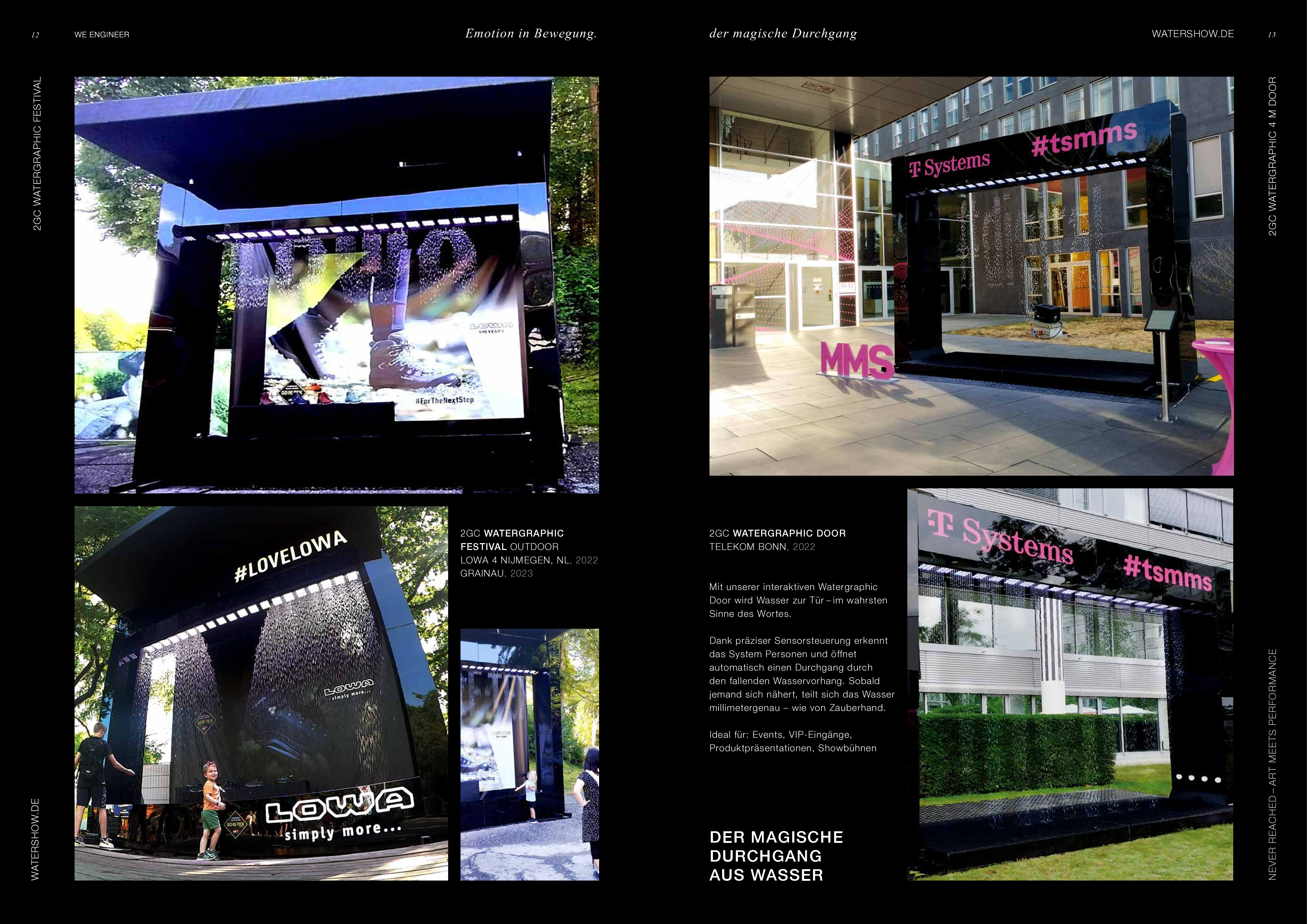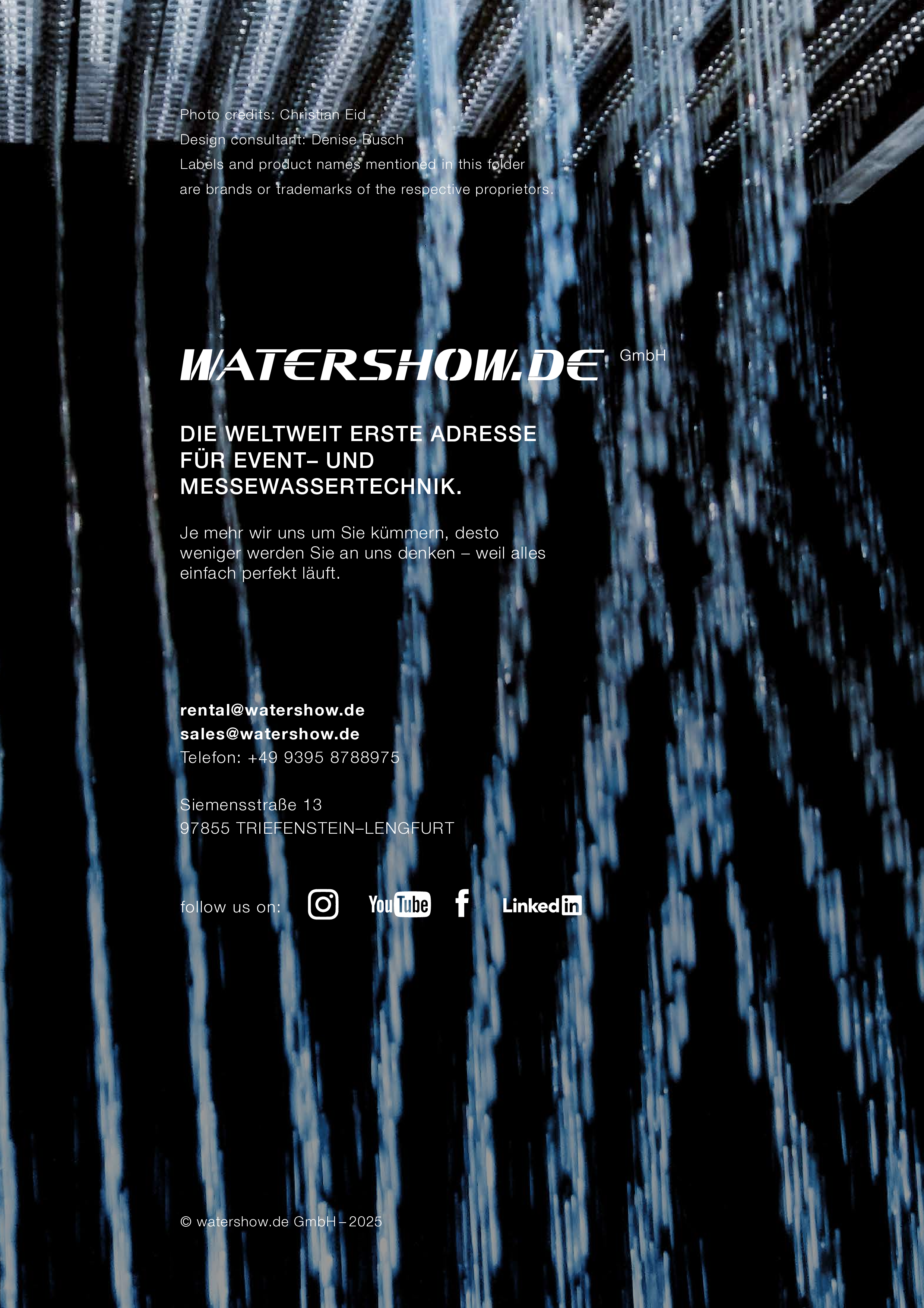 Watershow.de GmbH transforms water into unforgettable experiences. From dazzling fountains and elegant water walls to high-tech waterscreens that write logos and images with falling drops — every show is a one-of-a-kind highlight. With custom solutions, flawless engineering, and stunning visual impact, Watershow.de makes brands shine and events unforgettable.