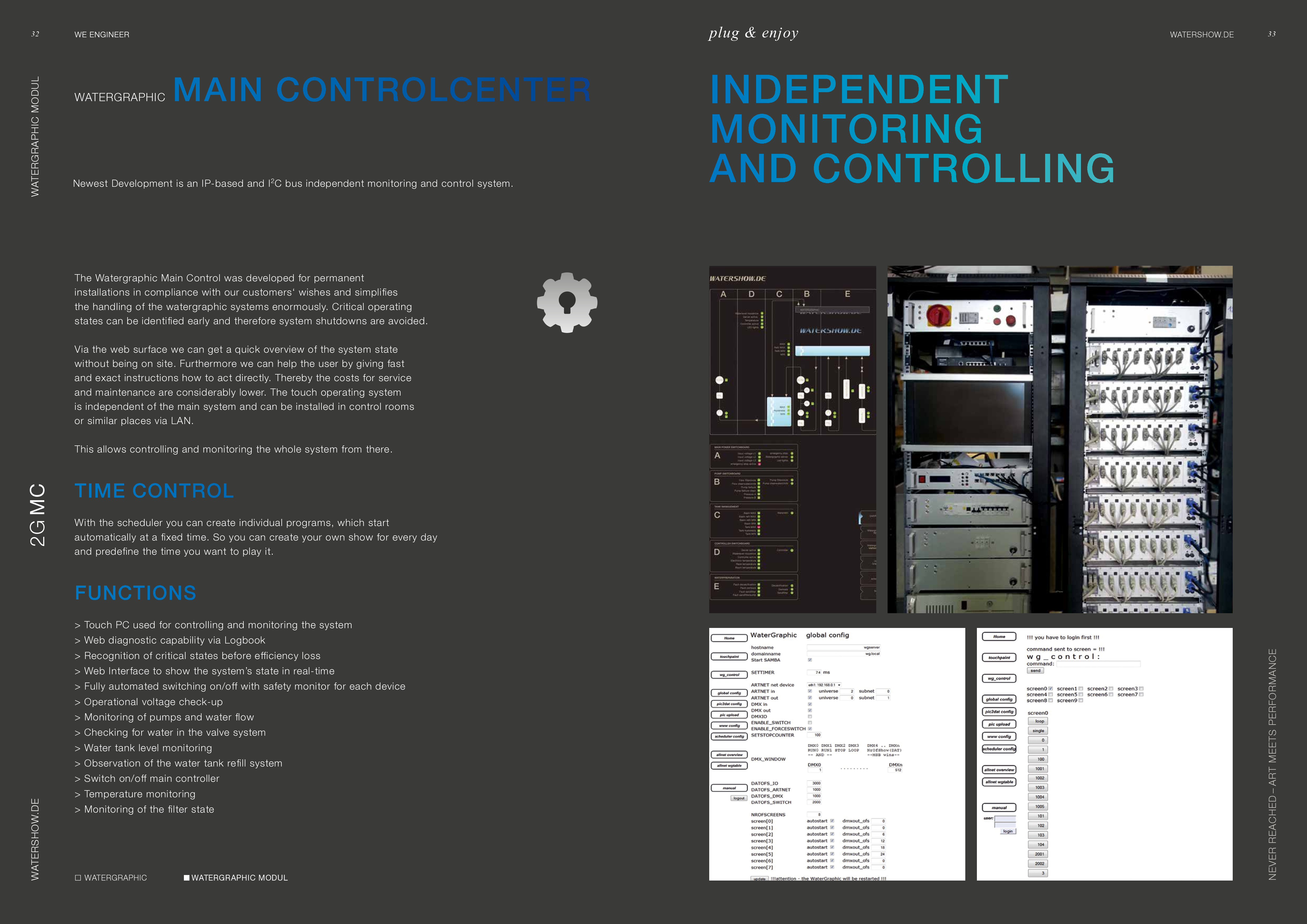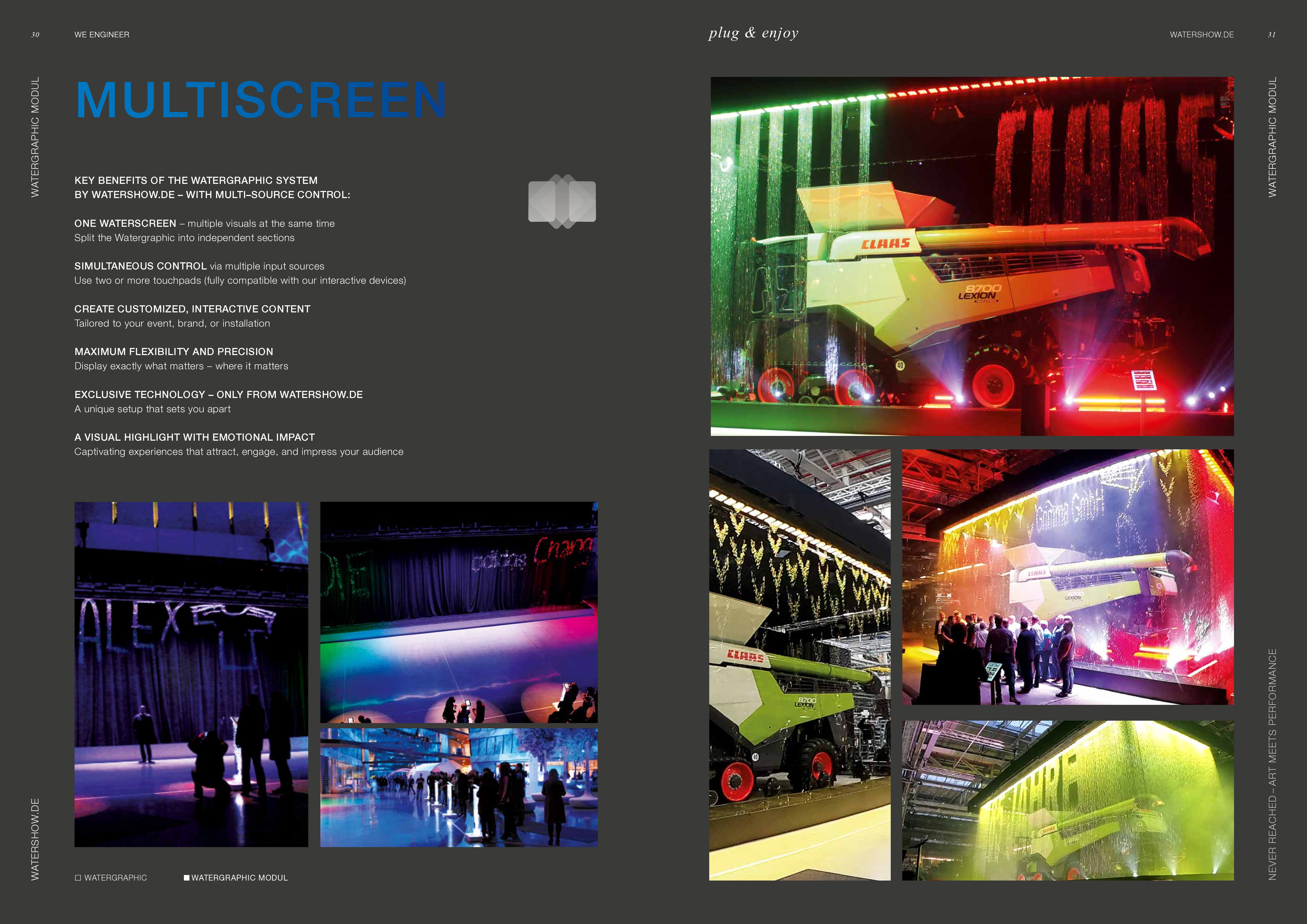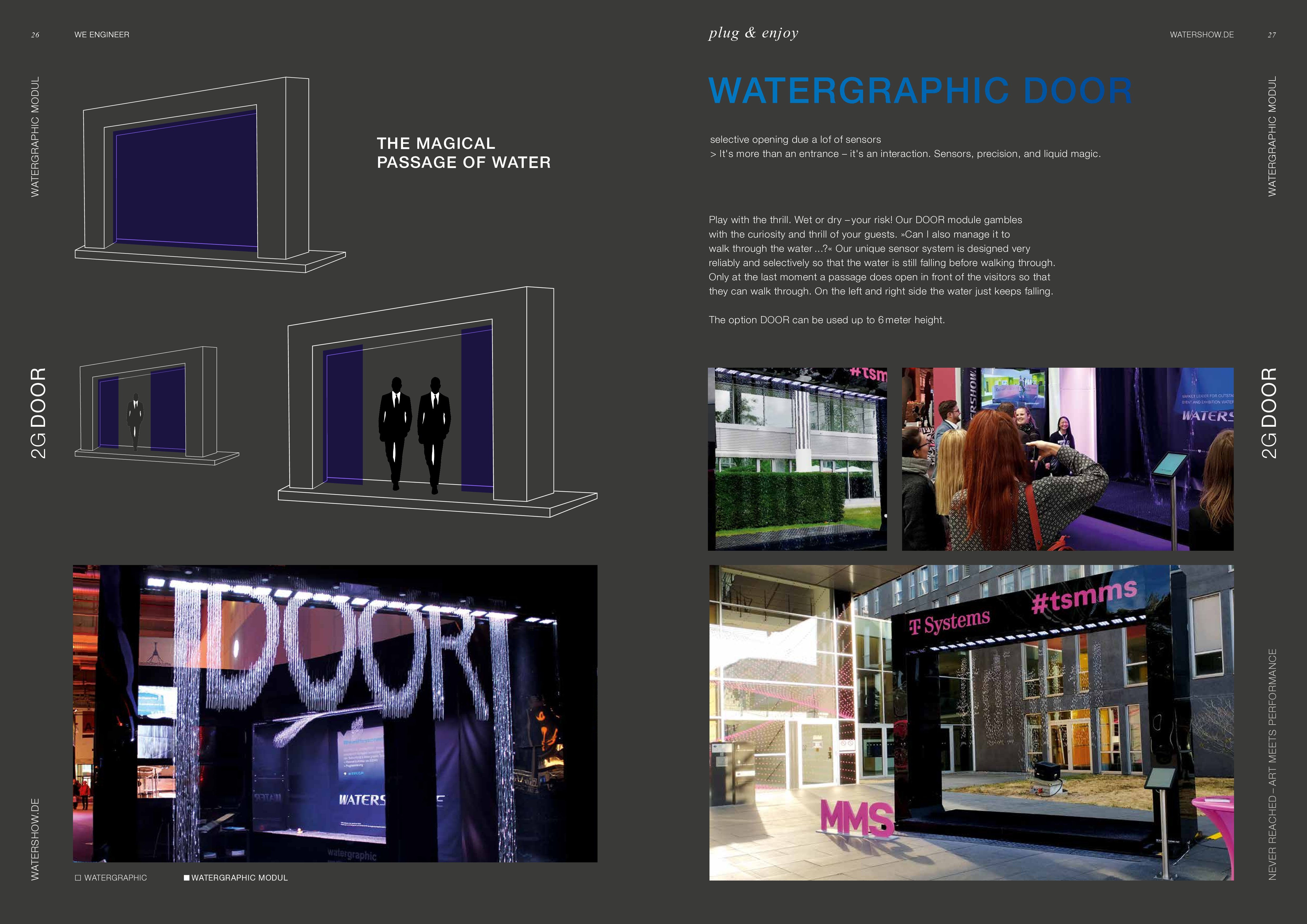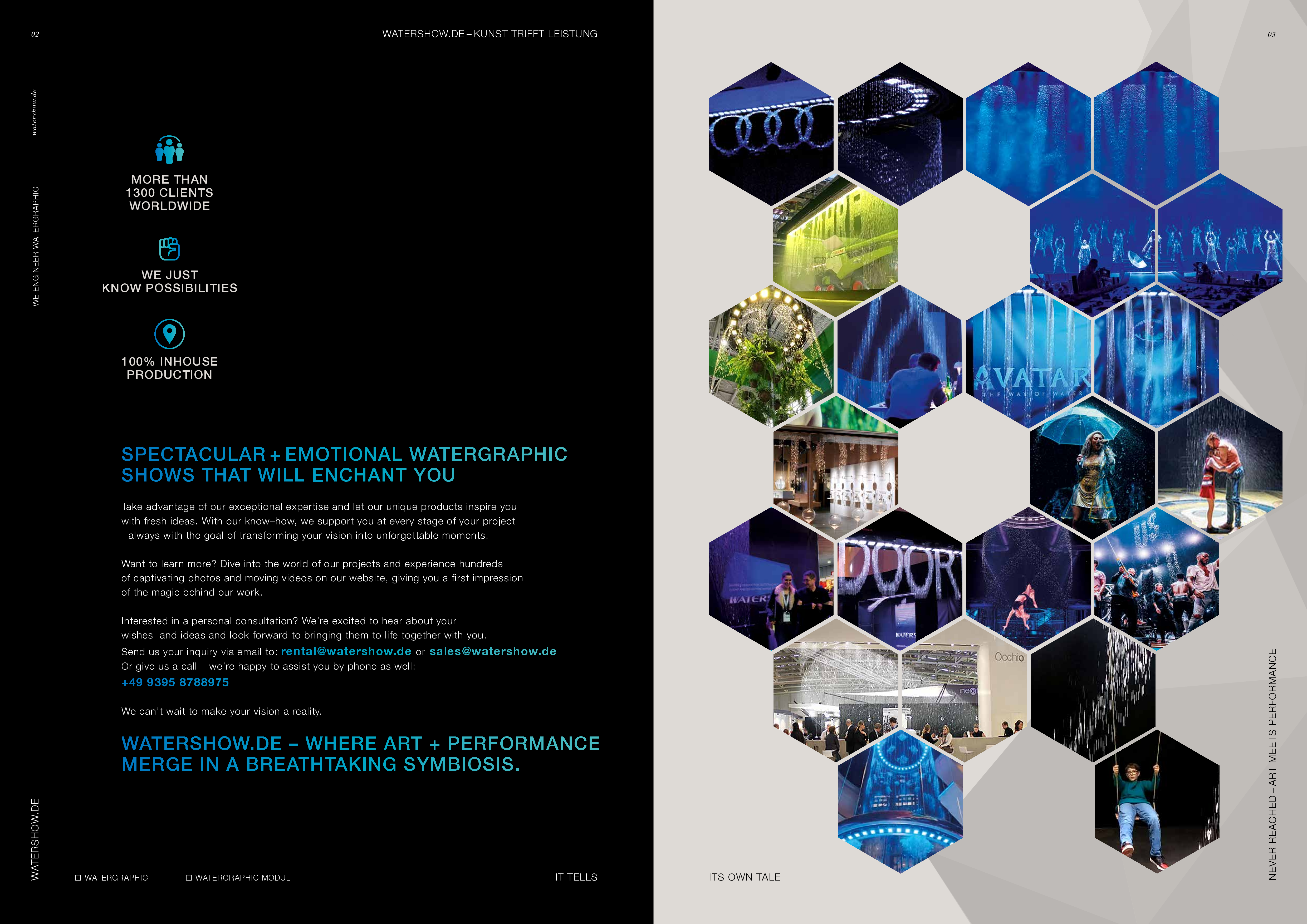 Watershow.de GmbH transforms water into unforgettable experiences. From dazzling fountains and elegant water walls to high-tech waterscreens that write logos and images with falling drops — every show is a one-of-a-kind highlight. With custom solutions, flawless engineering, and stunning visual impact, Watershow.de makes brands shine and events unforgettable.